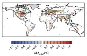 The image above shows the local effects of deforestation on hottest day temperatures in different parts of the world from 1981-2000, when compared to pre-industrial conditions. On the charts, red is used to show a net increase in the temperature on the hottest day of the year, while blue shows a net decrease. Boxes are used to highlight the results for North America, Europe, and Asia.