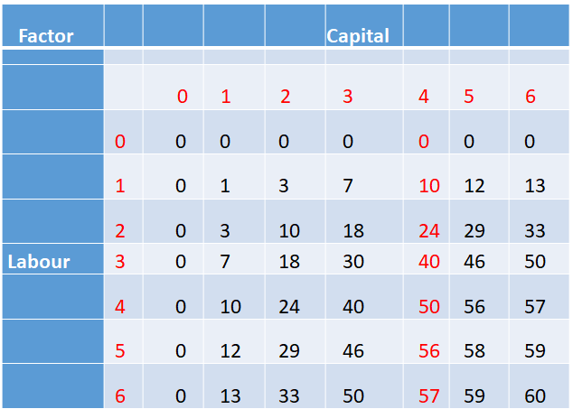 •The last column of table gives us a numerical example of average product of labour (with capital fixed at 4) for the production function described in table.
