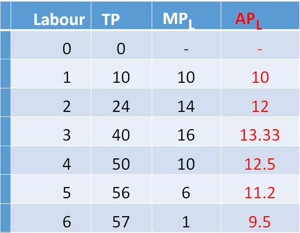 •Average Product is calculated as APL=TPL/L