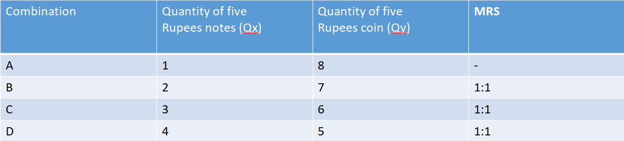 The consumer is indifferent for all these combinations as long as the total of five rupee coins and five rupee notes remains the same.